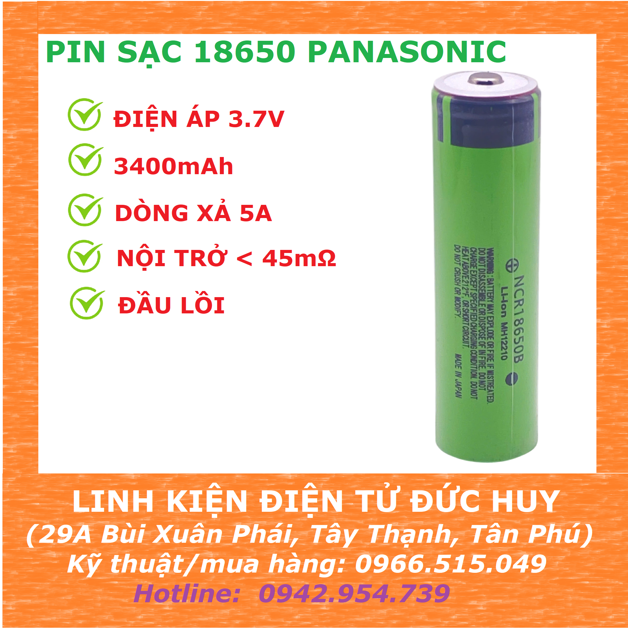 - Pin Panasonic 18650 lithium không được ghi nhãn hiệu và thông tin dung lượng trên vỏ ngoài của pin, model tương ứng của Panasonic 3400mah là NCR18650B, mong đại đa số người mua biết!