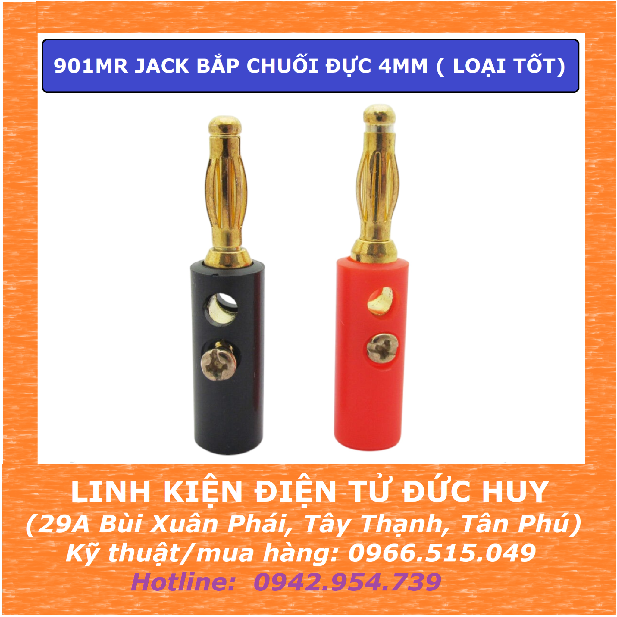 901MR JACK BẮP CHUỐI ĐỰC 4MM ( LOẠI TỐT ) Là loại đầu nối điện chuyên dùng để kết nối nhanh các thiết bị đo, nguồn, mạch điện tử, hoặc máy thực hành. Nó phổ biến trong phòng thí nghiệm, phòng kỹ thuật, hoặc các ứng dụng DIY điện tử