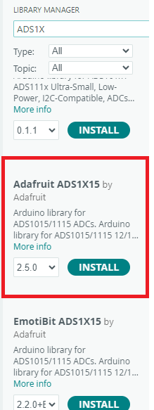 Uses Adafruit ADS1X15 library which can be downloaded via IDE