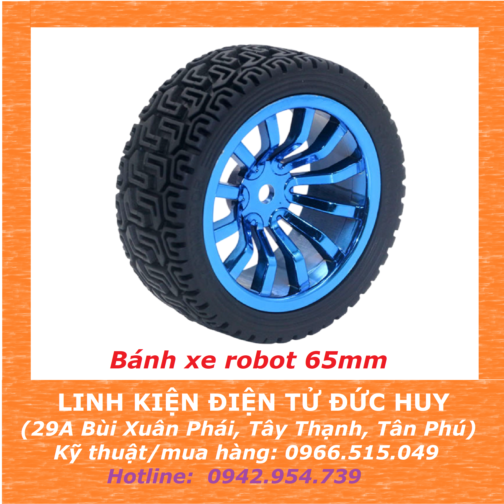 Bánh xe đường kính 65mm là loại thường được sử dụng nhất trong các thiết kế robot có động cơ kim loại. Bánh xe có chất lượng rất tốt, giá thành phải chăng, dễ lắp ráp và ứng dụng vào thiết kế. Bánh xe thường được sử dụng kèm với khớp nối lục giác để có thể gắn với động cơ.