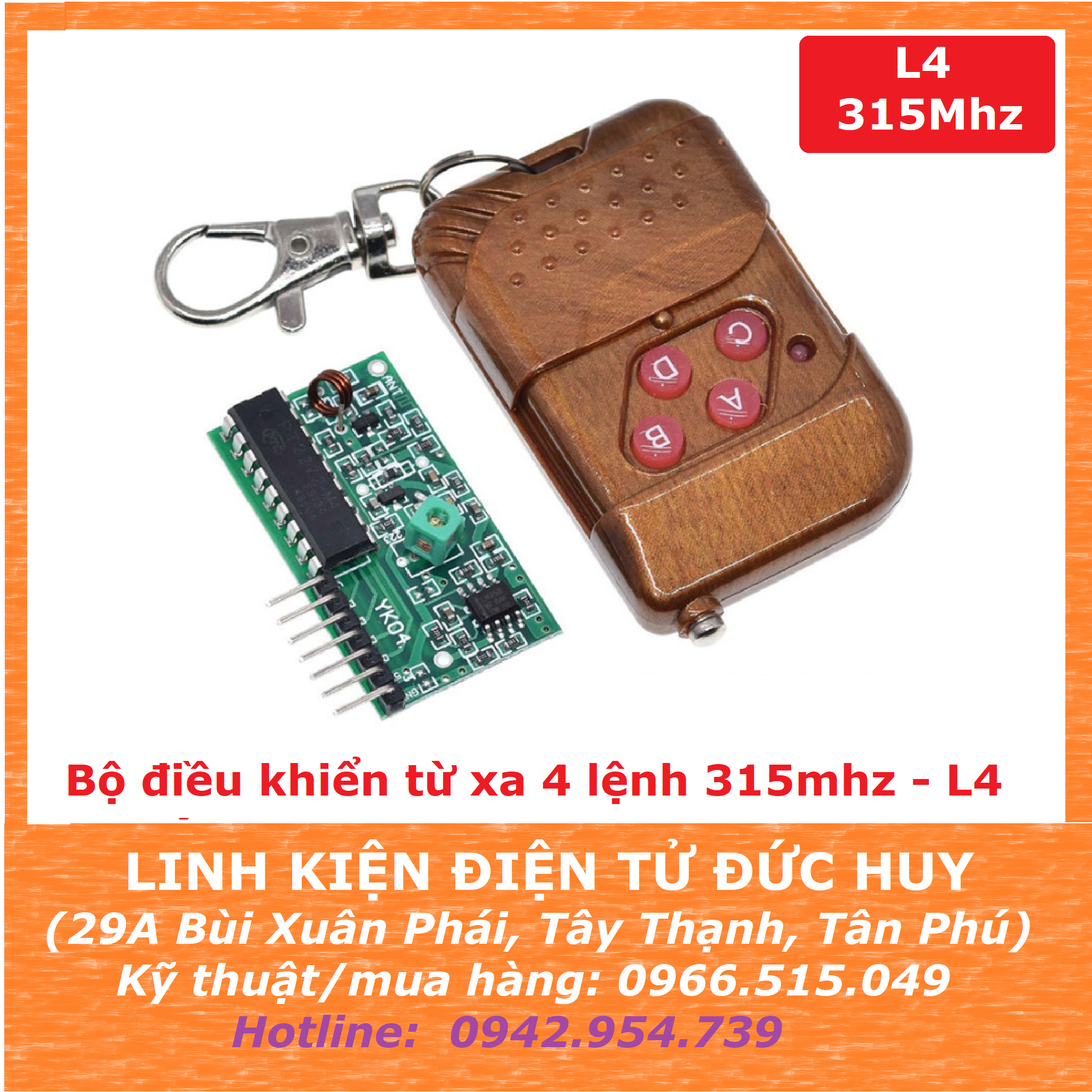 + Là bộ remote điều khiển từ xa với tần số 315Mhz, có 4 đầu ra D0, D1, D2, D3 tương ứng với 4 nút điều khiển trên remote, khoảng cách truyền xa lý tưởng lên đến 100m (khi có ăng ten đầy đủ, môi trường không bị nhiễu...)