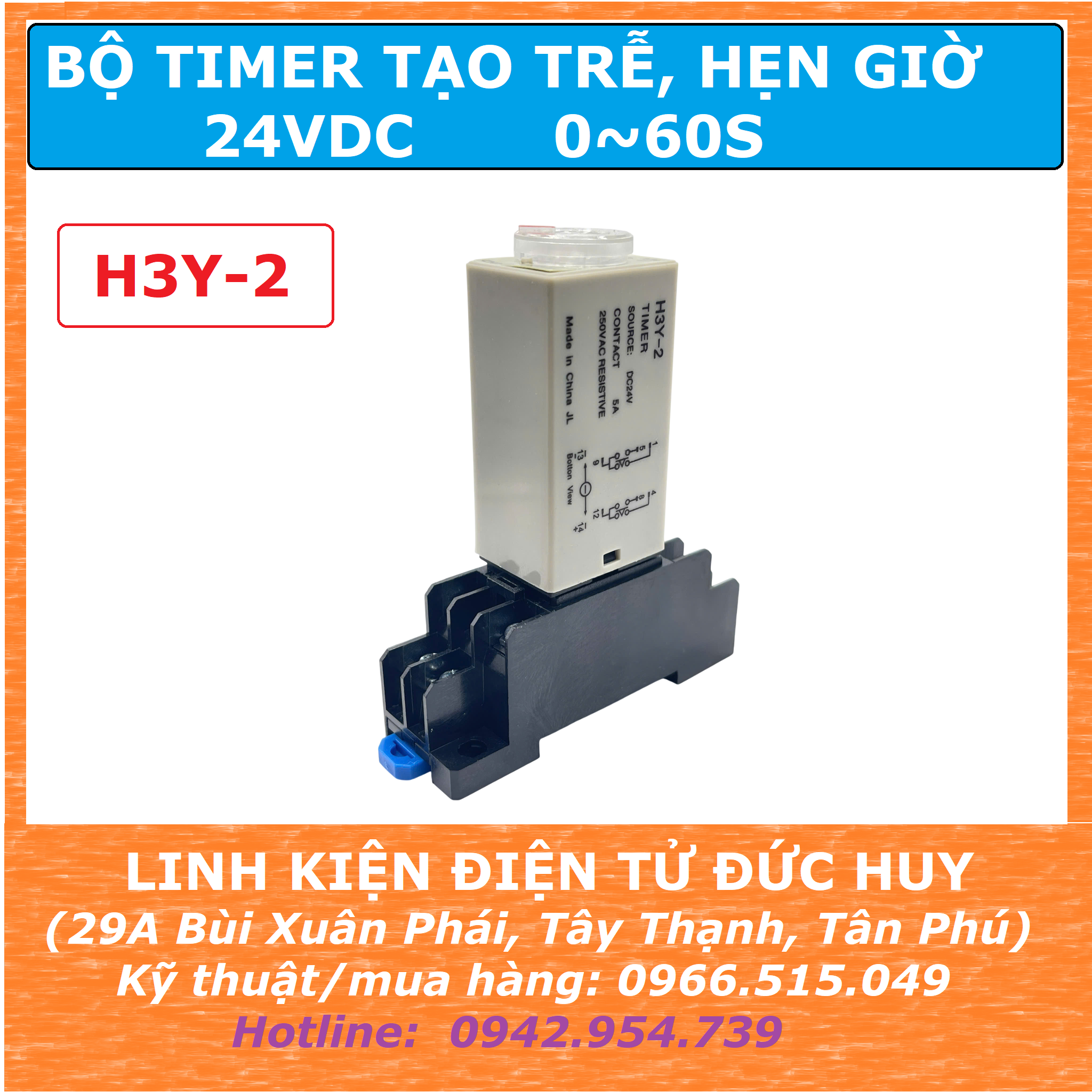 Bộ timer hẹn giờ, tạo trễ 24VDC 0-60S H3Y-2 (đã bao gồm đế) thuộc loại rơ le thời gian bán dẫn, có kích thước nhỏ gọn, phù hợp với nhiều ứng dụng công nghiệp với các dải thời gian va điện áp khác nhau. Bộ Relay timer H3Y-2 được sử dụng trong: Công nghệ chế tạo, luyện kim, điện tử, giấy và in bao bì, đúc nhựa, sản xuất gỗ, các loại dây chuyền sản xuất công nghiệp,....
