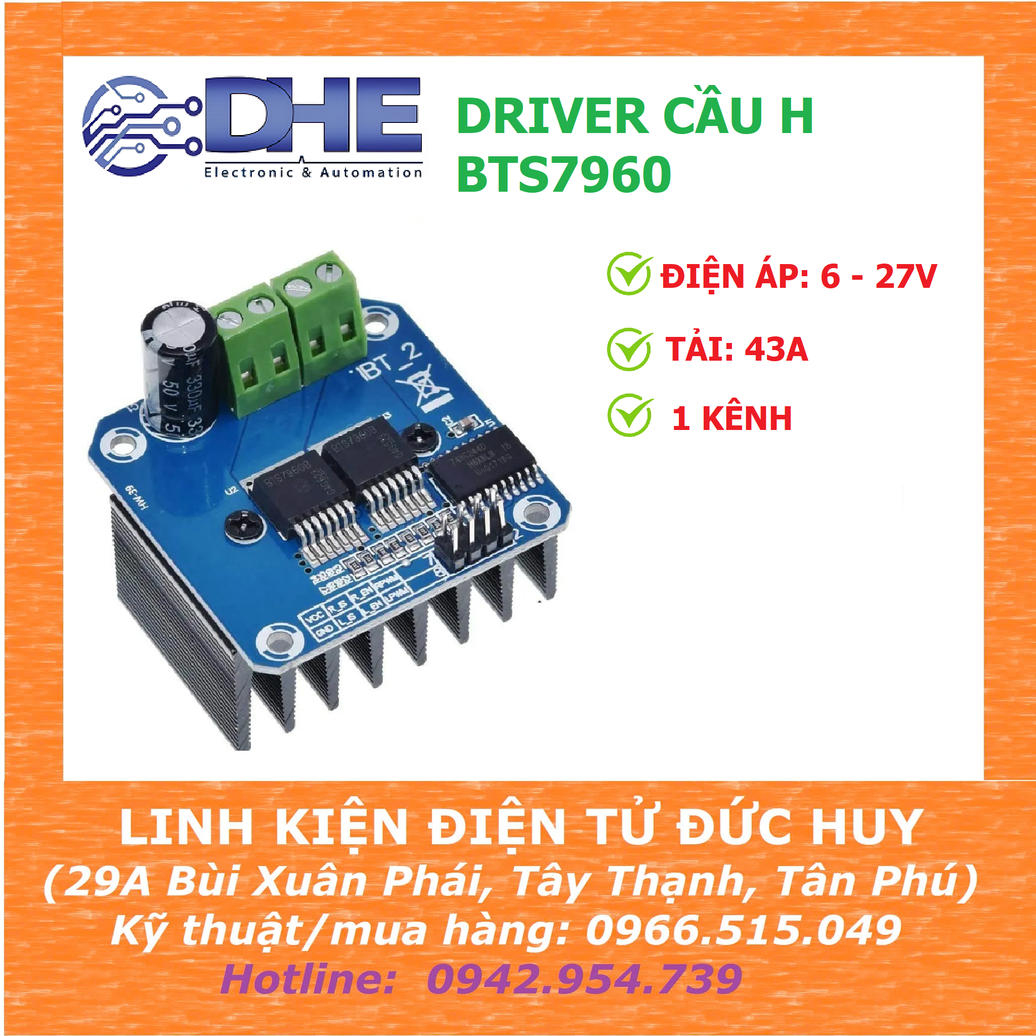 Mạch cầu H - BTS7960 43A dễ dàng giao tiếp với vi điều khiển với driver tích hợp sẵn trong IC với đầy đủ các tính năng current sense (kết hợp với điện trở đo dòng), tạo dead time, chống quá nhiệt, quá áp, quá dòng, sụt áp và ngắn mạch.