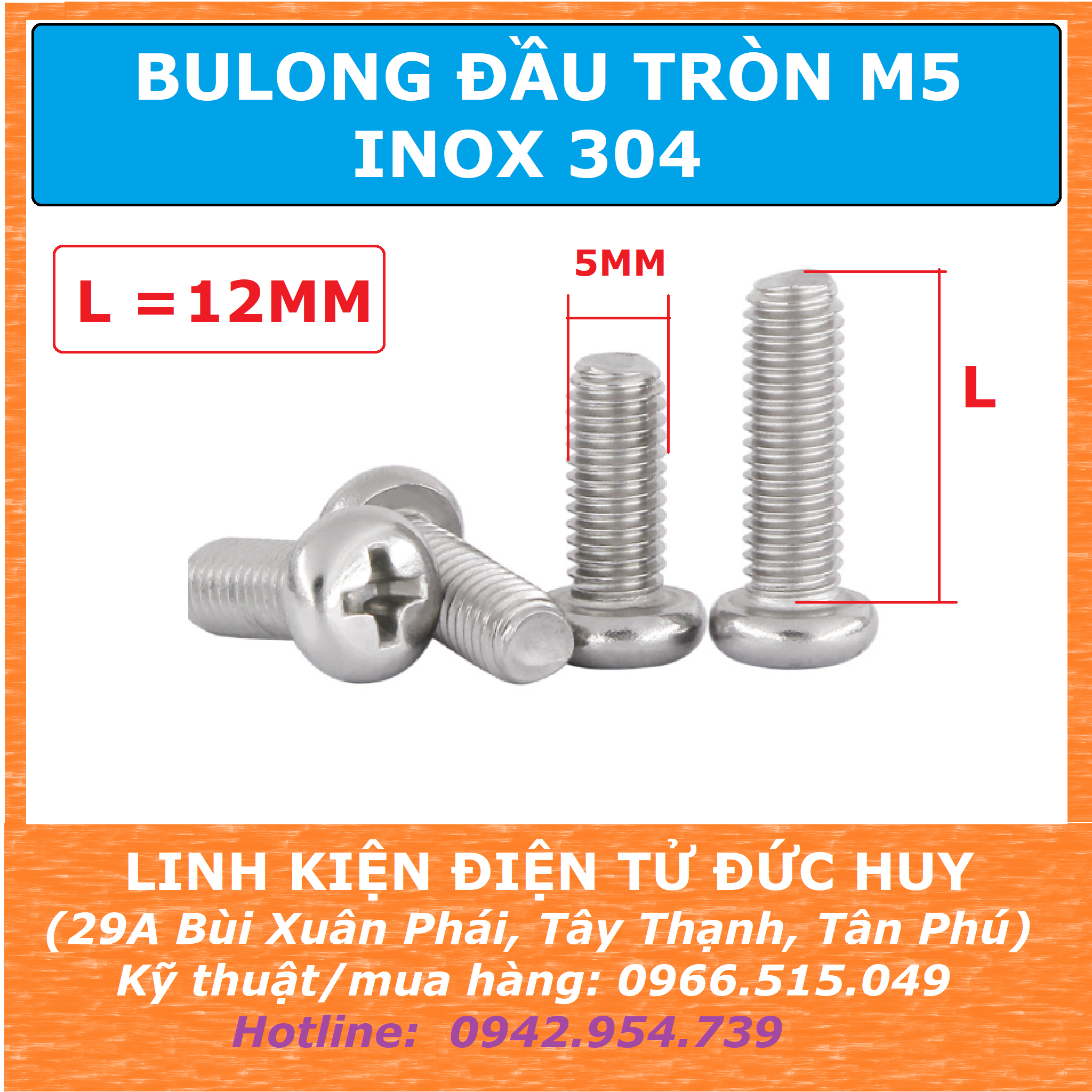 - Chiều dài thân ren (không bao gồm đầu tròn): 12mm