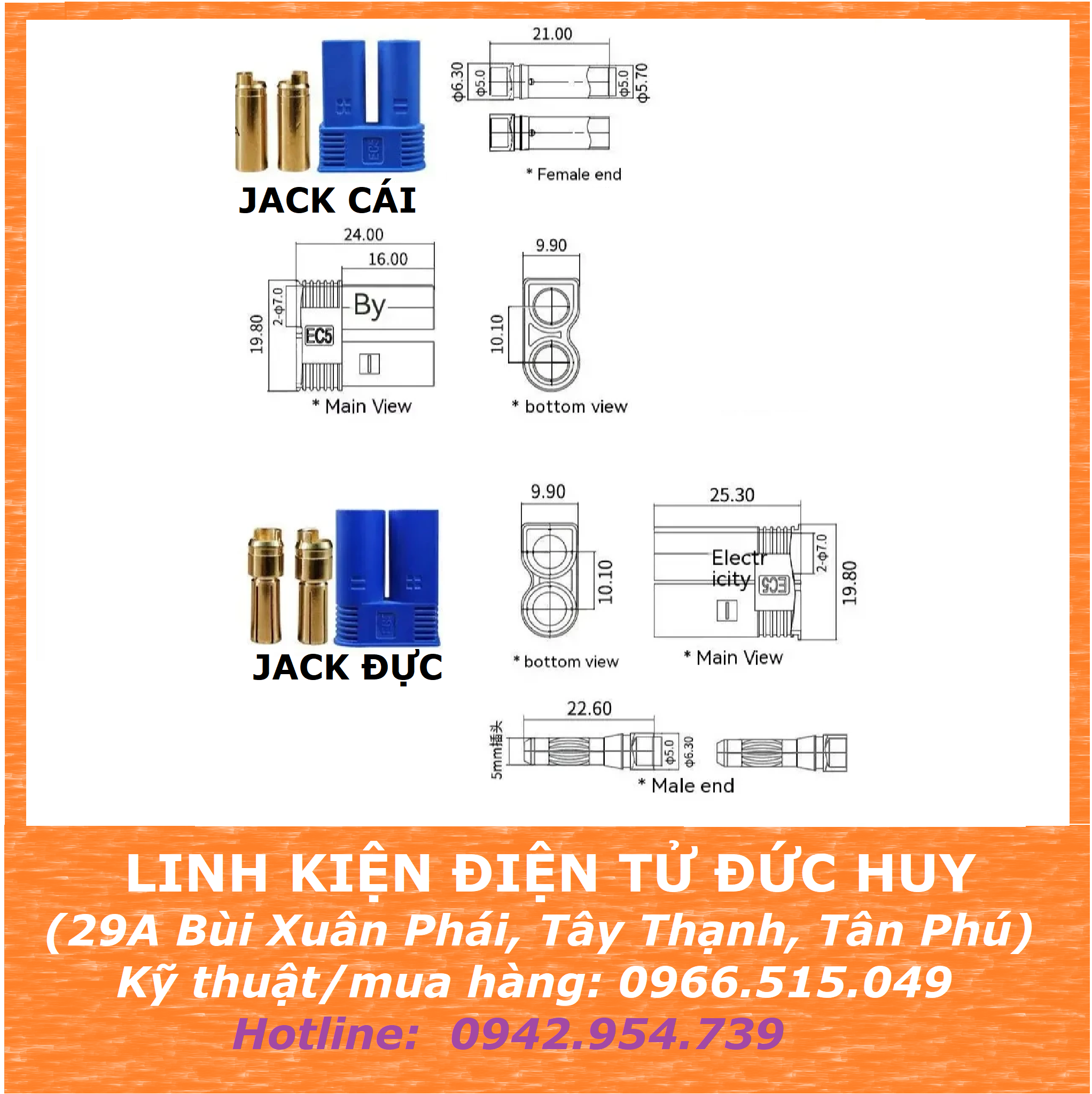 EC5 JACK CẮM NGUỒN ĐỰC CÁI, DÒNG TẢI TỐI ĐA 100A Cho RC Kèm Vỏ Cách Điện là bộ phụ kiện kết nối chuyên dụng cho pin, ESC và motor trong các thiết bị RC như máy bay, drone, xe điều khiển, thuyền điều khiển.