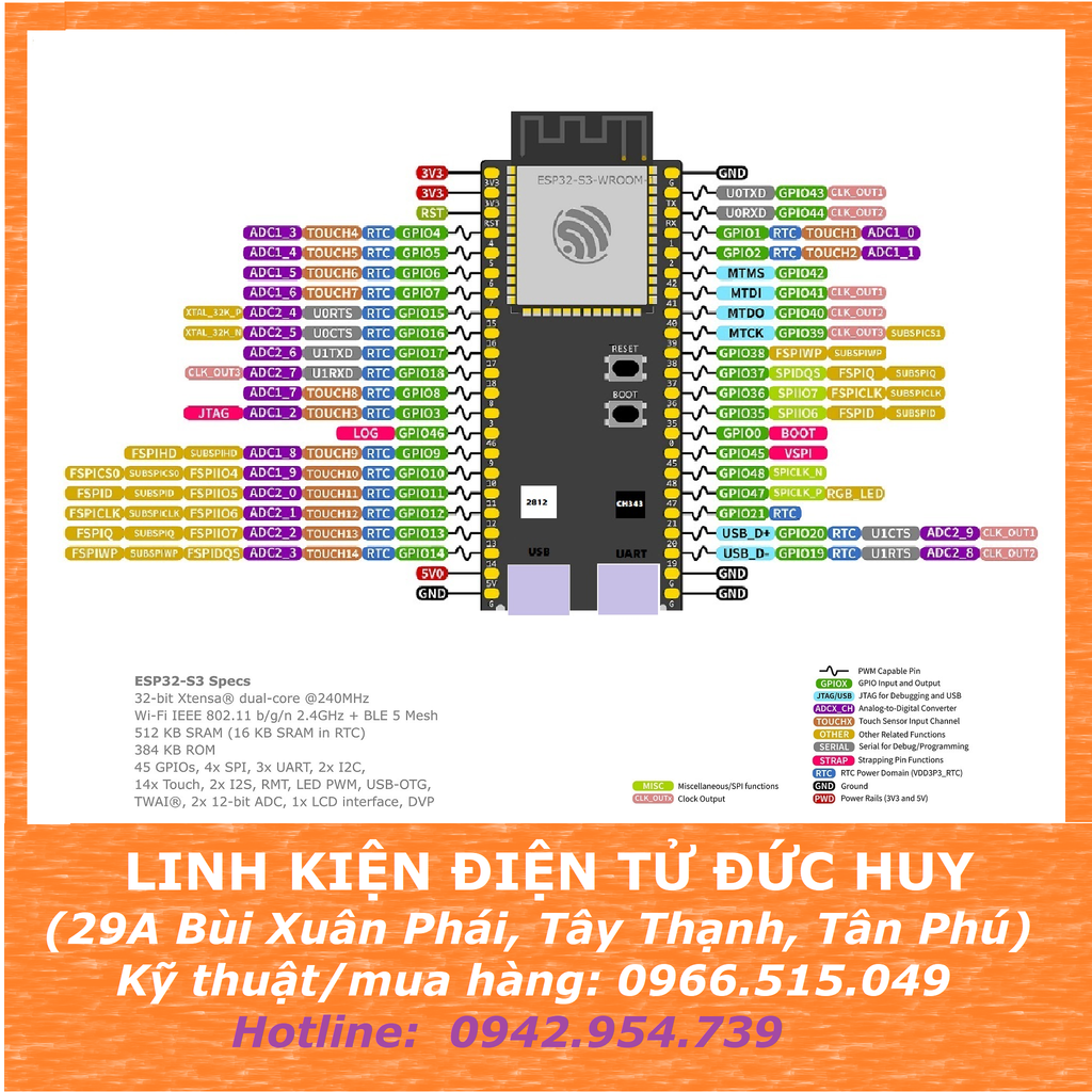 + Có một đèn LED RGB WS2812 được kết nối với IO38. Nó có đèn LED Đỏ, Xanh lục và Xanh lam có thể định địa chỉ riêng lẻ. Mô-đun này có 2 đầu nối USB Type C. Một đầu nối được sử dụng để cấp nguồn cho bo mạch, để flash các ứng dụng vào chip, cũng như để giao tiếp với chip thông qua cầu nối USB-to-UART trên bo mạch. Nó được kết nối với UART của chip ESP32 thông qua chip CH340. Đầu nối USB thứ hai được kết nối với giao diện USB OTG tốc độ đầy đủ ESP32-S3, tuân thủ thông số kỹ thuật của USB 1.1. Nó cũng có thể được sử dụng để cấp nguồn cho bo mạch, để flash các ứng dụng vào chip, để giao tiếp với chip bằng giao thức USB 1.1, cũng như để gỡ lỗi JTAG.