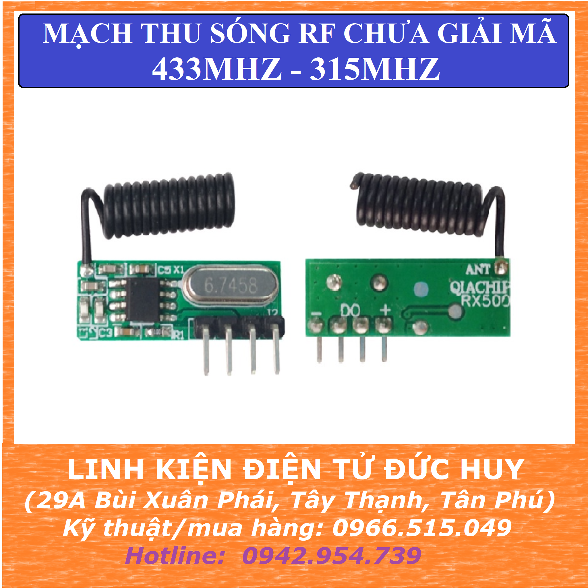 MẠCH THU SÓNG RF 433MHZ CHƯA GIẢI MÃ RX500, là mạch thu không dây sóng RF dùng để thu phát sóng tần số 433mhz đưa vào vi điều khiển hoặc IC chuyên dụng để giải mã.