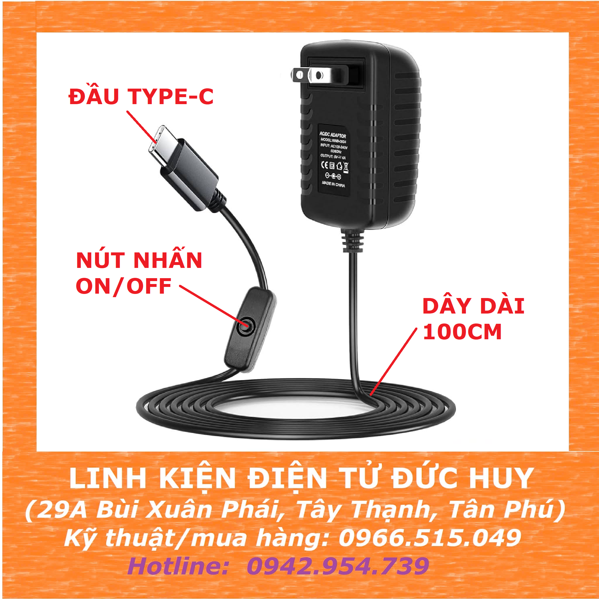 Nguồn Adapter 5V 3A Type-C cho Raspberry Pi 4 - có switch ON/OFF là nguồn cung cấp điện áp tiêu chuẩn 5V 3000mA cho Raspberry Pi 4 B. Chuẩn kết nối Type C tương thích cho đầu vào Raspberry Pi 4