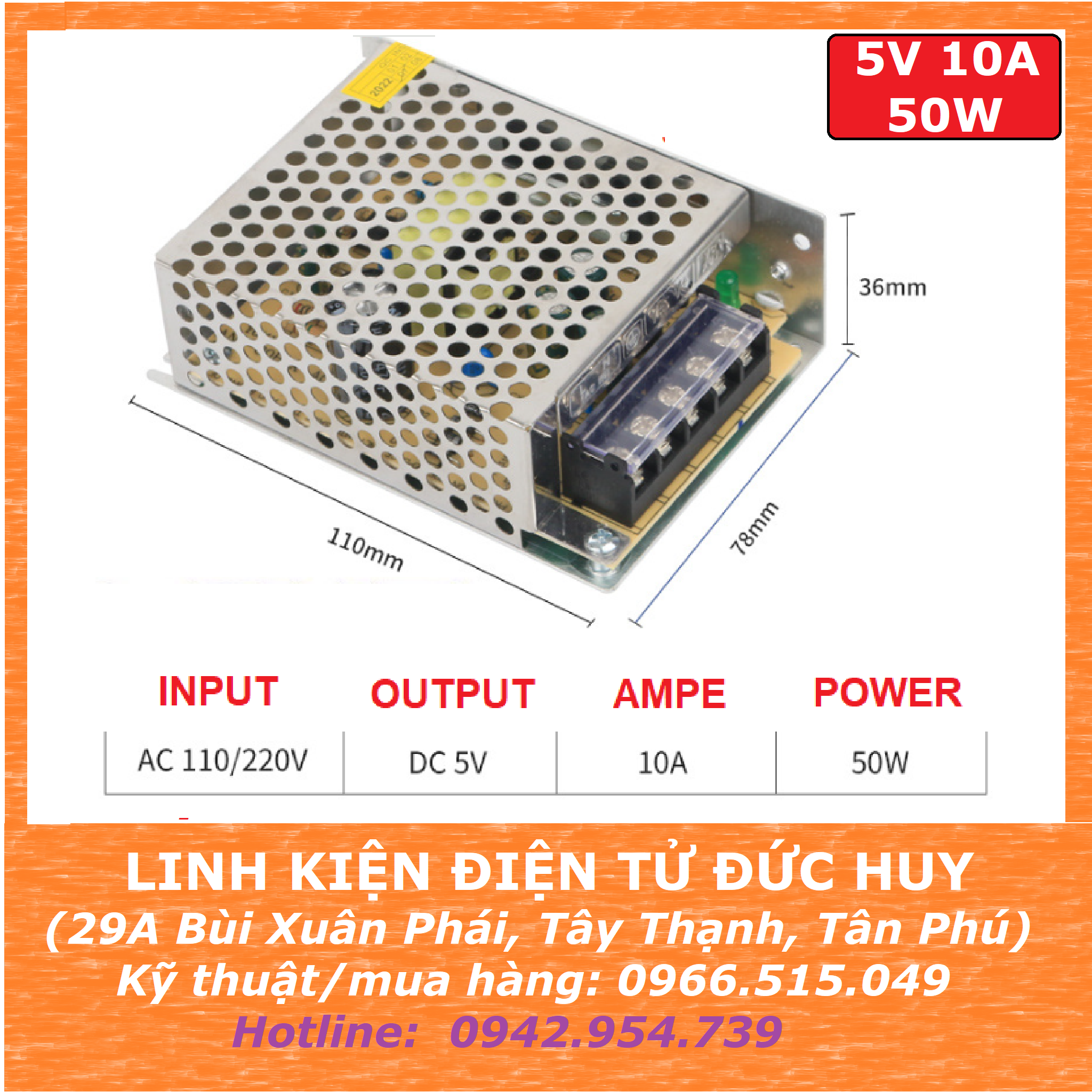 THÔNG SỐ KỸ THUẬT: Điện áp đầu vào: 100VAC ~ 250VACTần số hoạt động: 47 ~ 63HZCông suất: 50WĐiện áp đầu ra: 5VDòng điện tối đa: 10AĐiện áp điều chỉnh:  ± 10%Hiệu suất ≥ 85%Điều chỉnh điện áp ( Đầy tải ) ≤ 0.3%Bảo vệ quá tải 105% —- 150% công suất định mức , phục hồi tự độngChức...