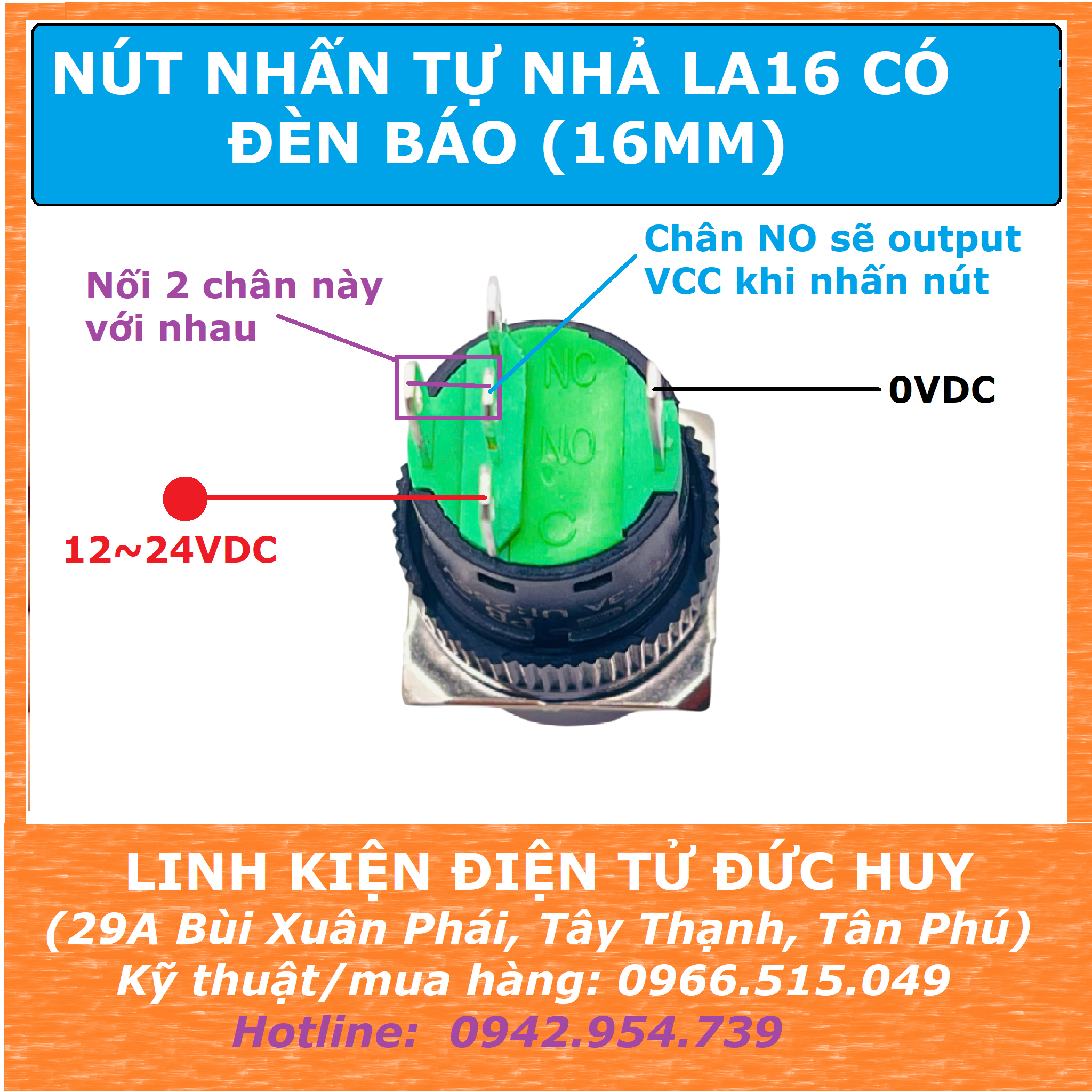 Nút nhấn 16MM LA16 tự nhả, có đèn báo 12-24VDC 5 chân là sản phẩm có kích thước nhỏ gọn (đường kính 16mm), với các màu đỏ, vàng, xanh lá để dễ dàng phân biệt. Ngoài ra sản phẩm này còn có đèn báo bên trong để dễ dàng phân biệt trong các trường hợp thiếu ánh sáng.