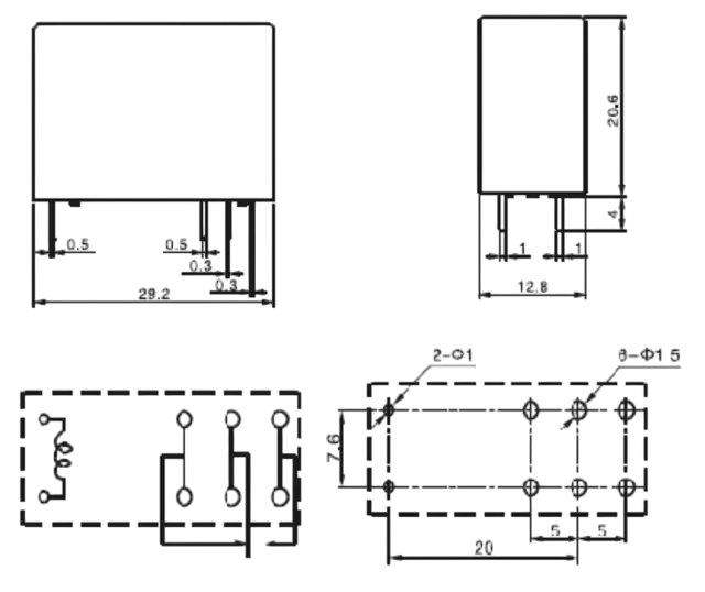 Sản phẩm có 3 tiếp điểm được mắc theo cặp: COM1-COM2, NO1-NO2, NC1-NC2 ứng dụng trong mạch điện tử đóng cắt nhiều thiết bị cùng lúc hoặc làm trung gian đóng cắt các thiết bị khác.