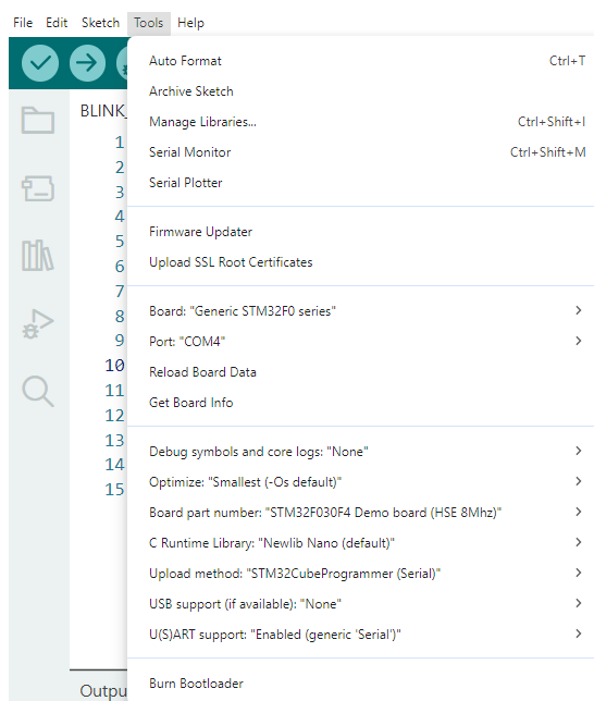 Vào Tools > Board > Boards Manager để tải về board STM32