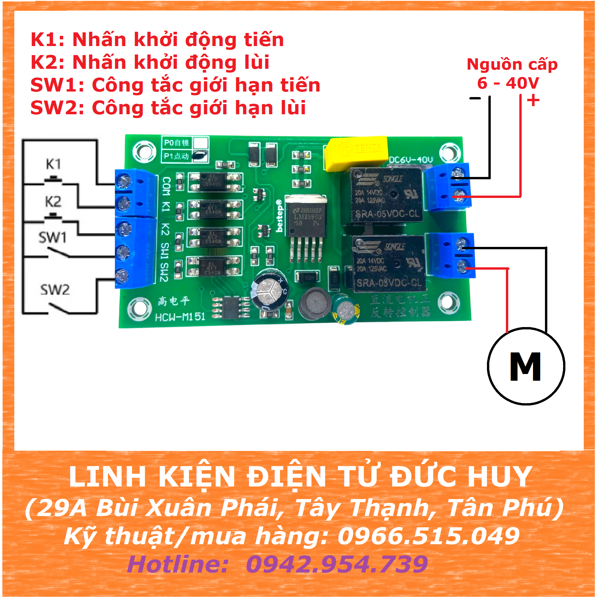 Kích K1/ K2 giữ trạng thái khi nhả K1/K2, động cơ quay tiến hay lùi khi chạm công tắc giới hạn SW1/ SW2 động cơ sẽ dừng. nếu nhả công tắc giới hạn động cơ sẽ không quay, động cơ chỉ quay khi kích lại K1/ K2.