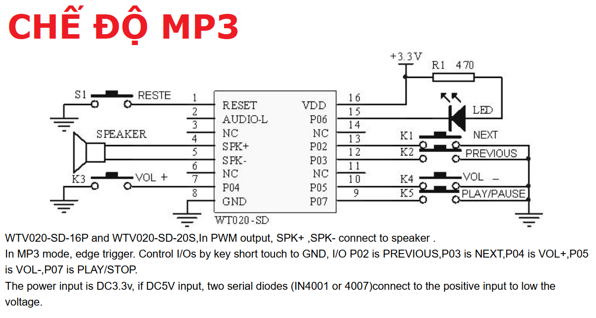 + Mô-đun này cần nguồn điện 3.3V để hoạt động và mức tiêu thụ điện năng rất thấp. Có thể dễ dàng sao chép các tệp giọng nói, âm thanh sang thẻ SD bằng máy tính và thẻ nhớ phải ở định dạng FAT.