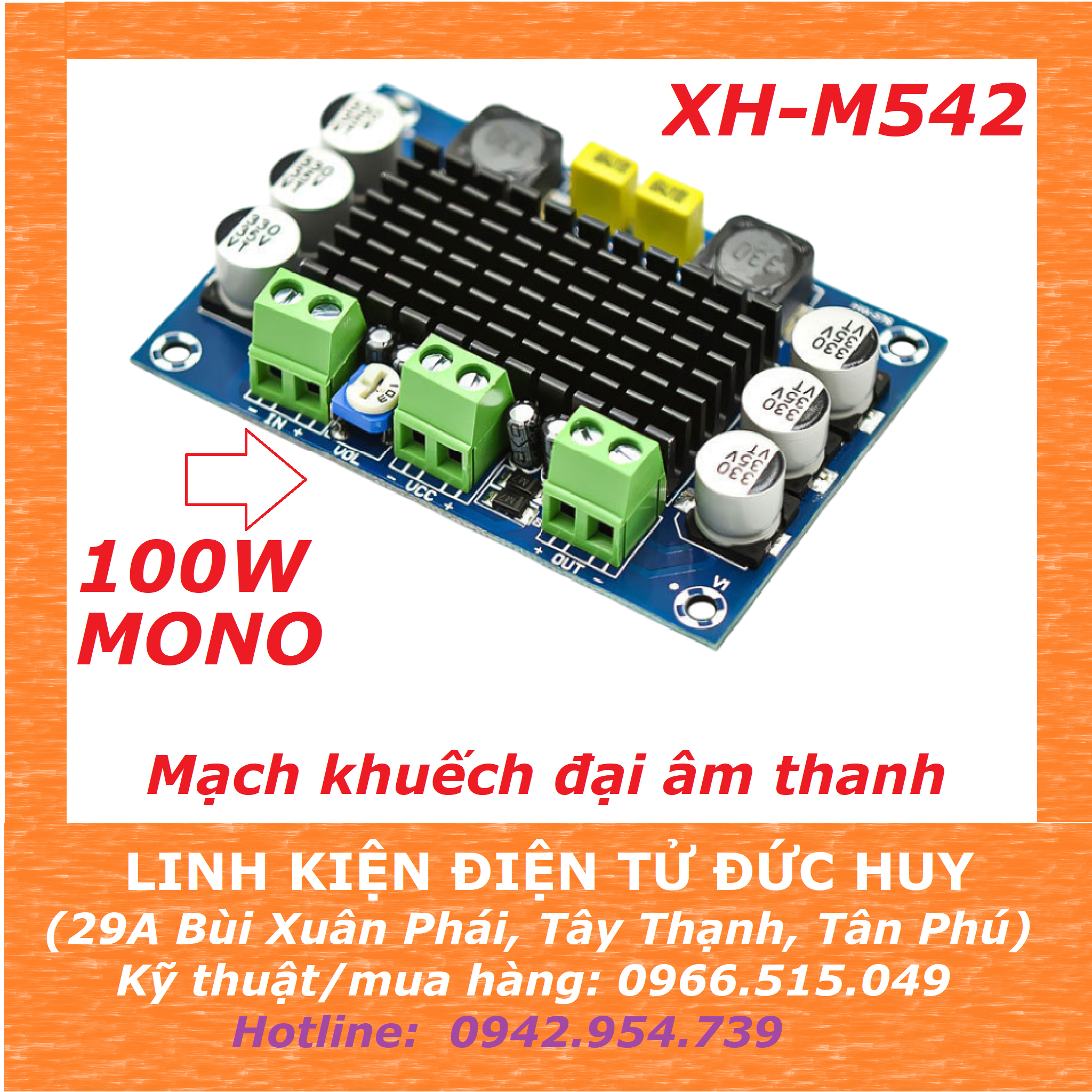 TPA3116D2 XH-M542 100W sử dụng chip khuếch đại Class D cho ngõ ra 1 kênh mono. Mạch khuếch đại âm thanh này có kích thước nhỏ gọn, có thể điều chỉnh âm lượng ngõ ra trực tiếp trên board bằng biến trở được tích hợp trên mạch.