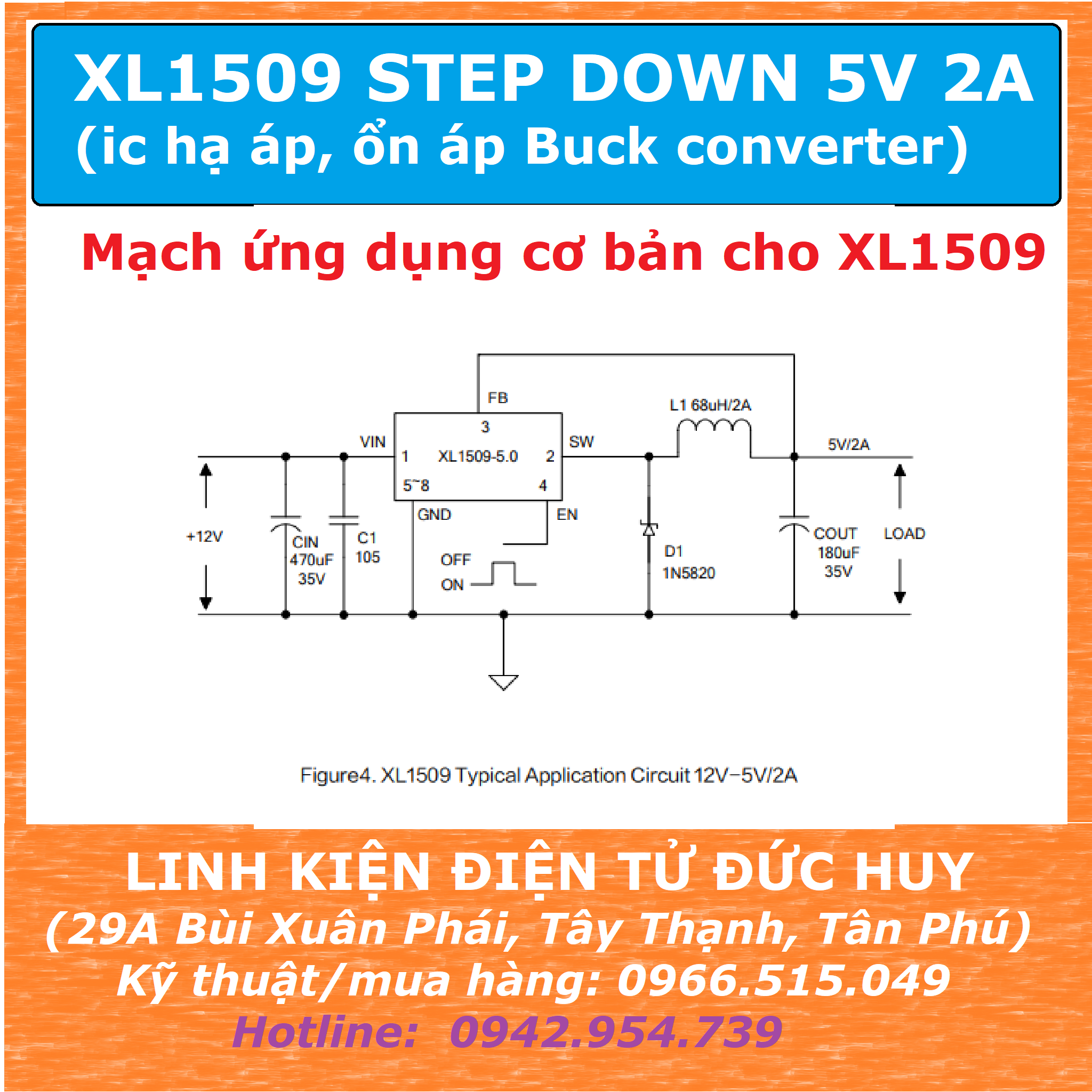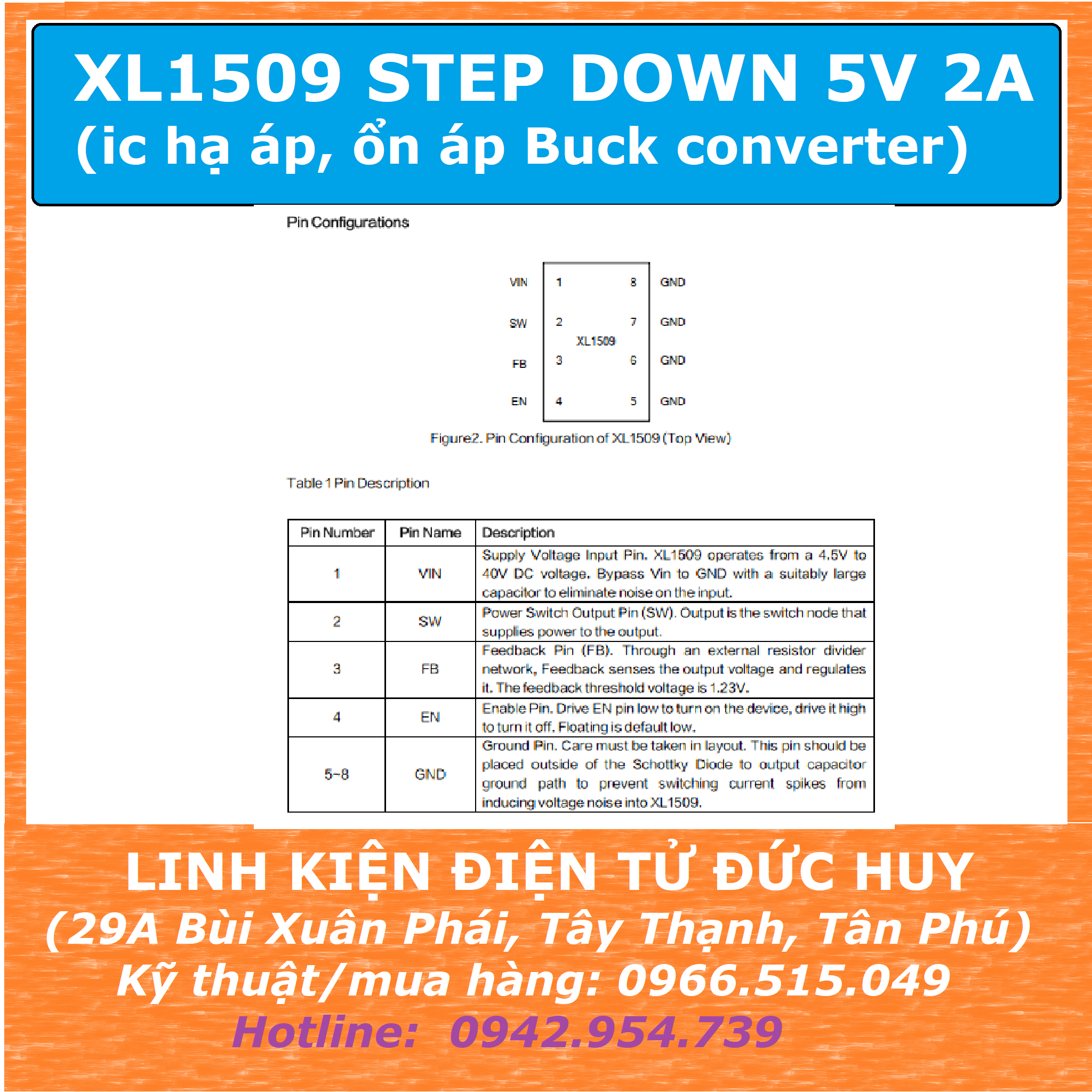 XL1509 SMD 5V 2A Buck converter DC DC là IC step down hạ áp ổn áp phù hợp các thiết bị tải nhỏ tầm khoảng 2A, dải điện áp đầu vào rộng 4.5~40VDC, điện áp đầu ra có thể fix 3.3V hoặc 5V hoặc 12V hoặc loại có thể điều chỉnh được đầu ra.